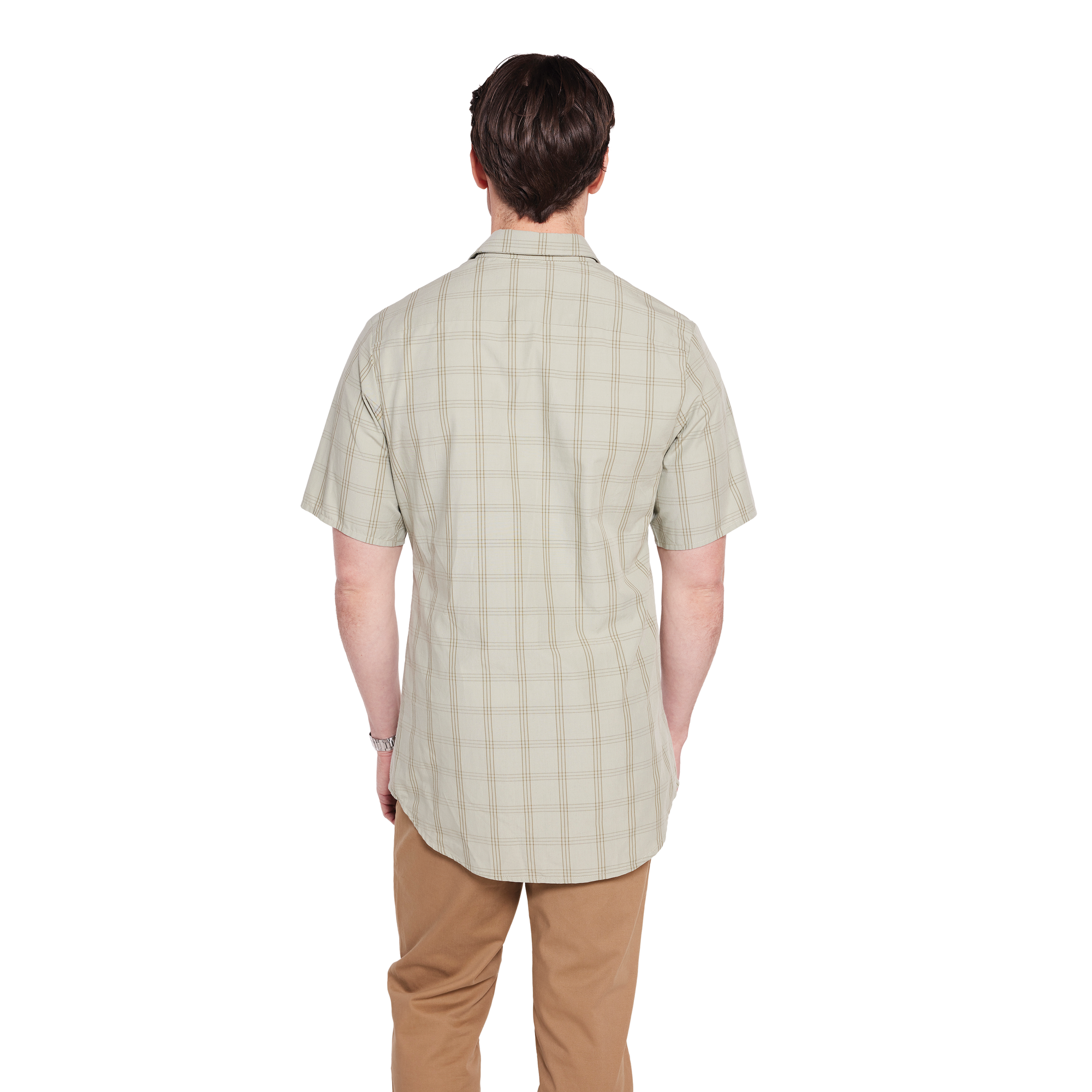 Woven shirt with a modern fit, curved hem, button-down placket, classic collar, short sleeves.